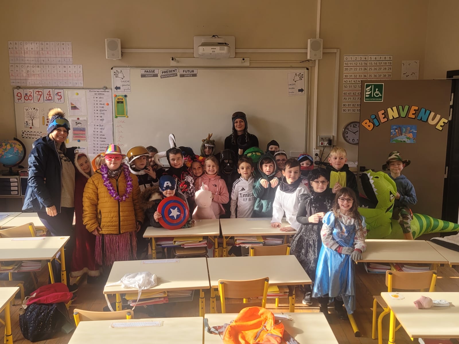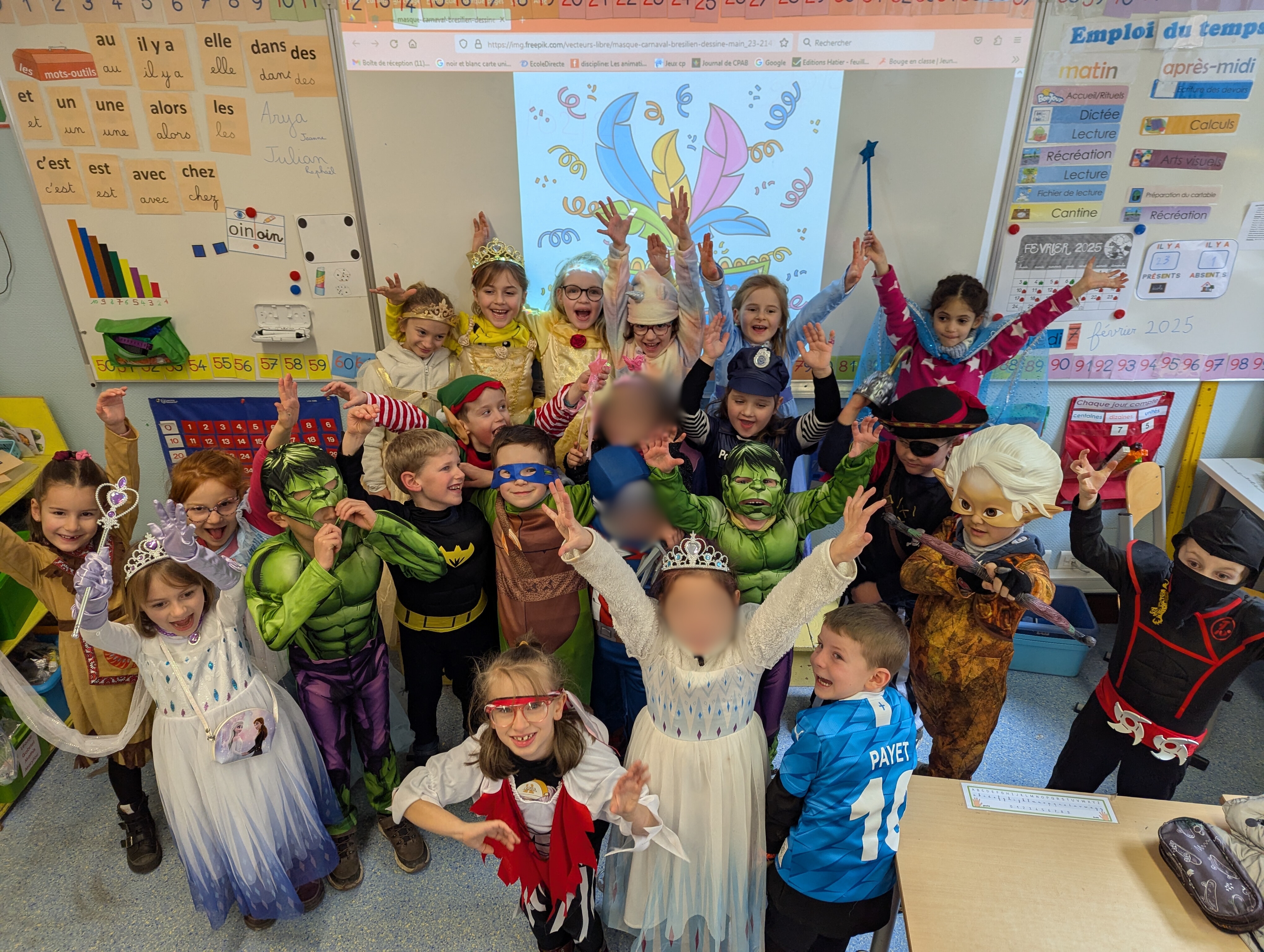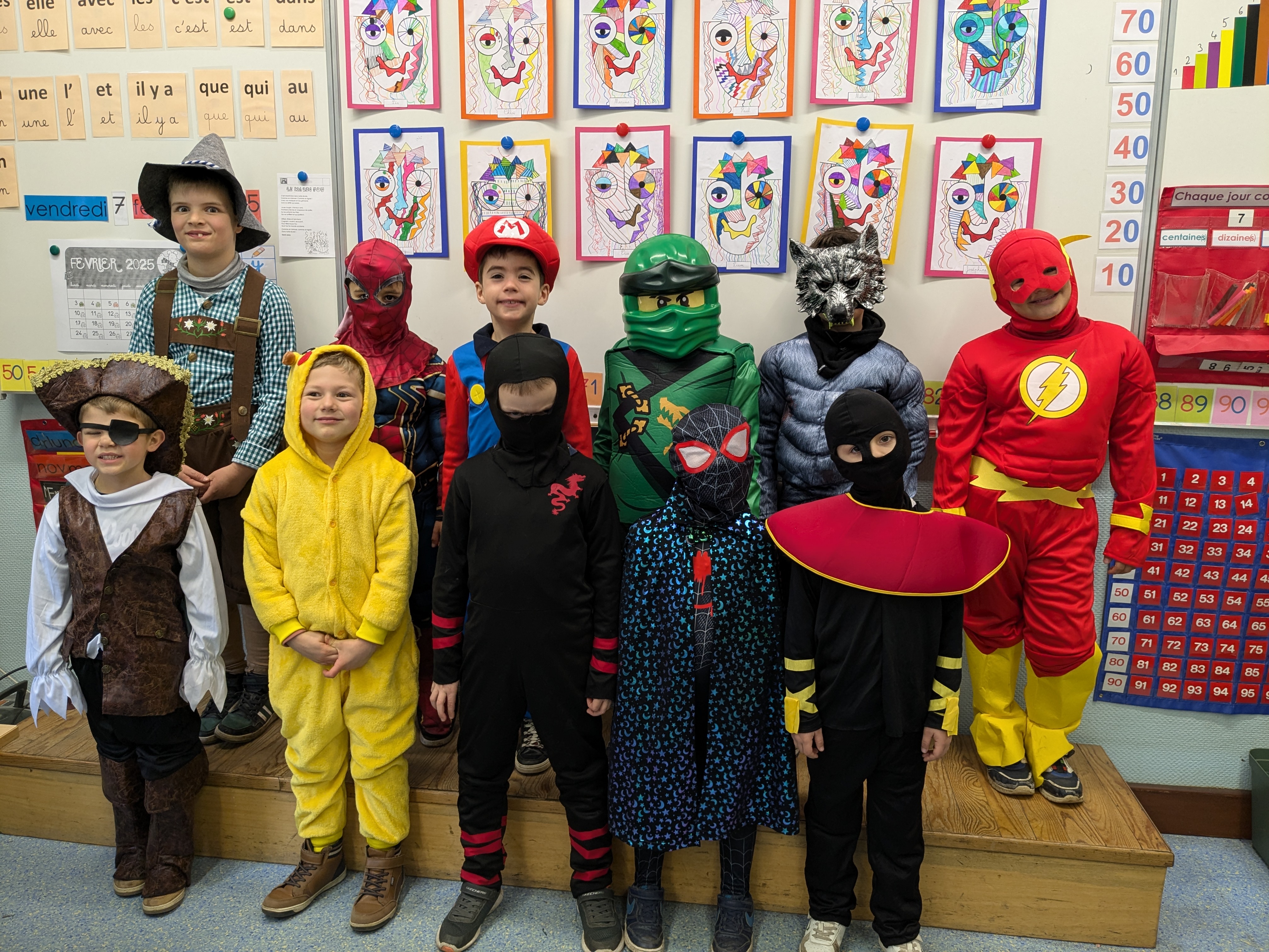 C'est désormais une tradition, tout Saint-Jo se déguise le dernier jour avant les vacances d'hiver afin de s'offrir une journée spéciale, avec tout l'Etablissement !... Ainsi, une joyeuse cohorte d'enfants a déambulé dans les couloirs pour aller gentiment mais bruyamment saluer les "grands frères" du Collège, et taquiner les équipes administratives !... Par la suite et dans une ambiance de discothèque de plein air, nos élèves se sont déhanchés sur les rythmes de notre "dj maison", qui a exceptionnellement troqué règle, compas et équerre contre ses platines !... Enfin, un grand Merci à nos CM2 qui ont offert gourmandises et douceurs à tous les enfants de l'Ecole (et même de l'Etablissement) autour d'un banquet carnavalesque !... Bien que le calendrier ne soit pas tout à fait respecté, nous aimons achever cette période dans une atmosphère de joie, de bonne humeur et de convivialité, principes chers à Saint-Joseph...
