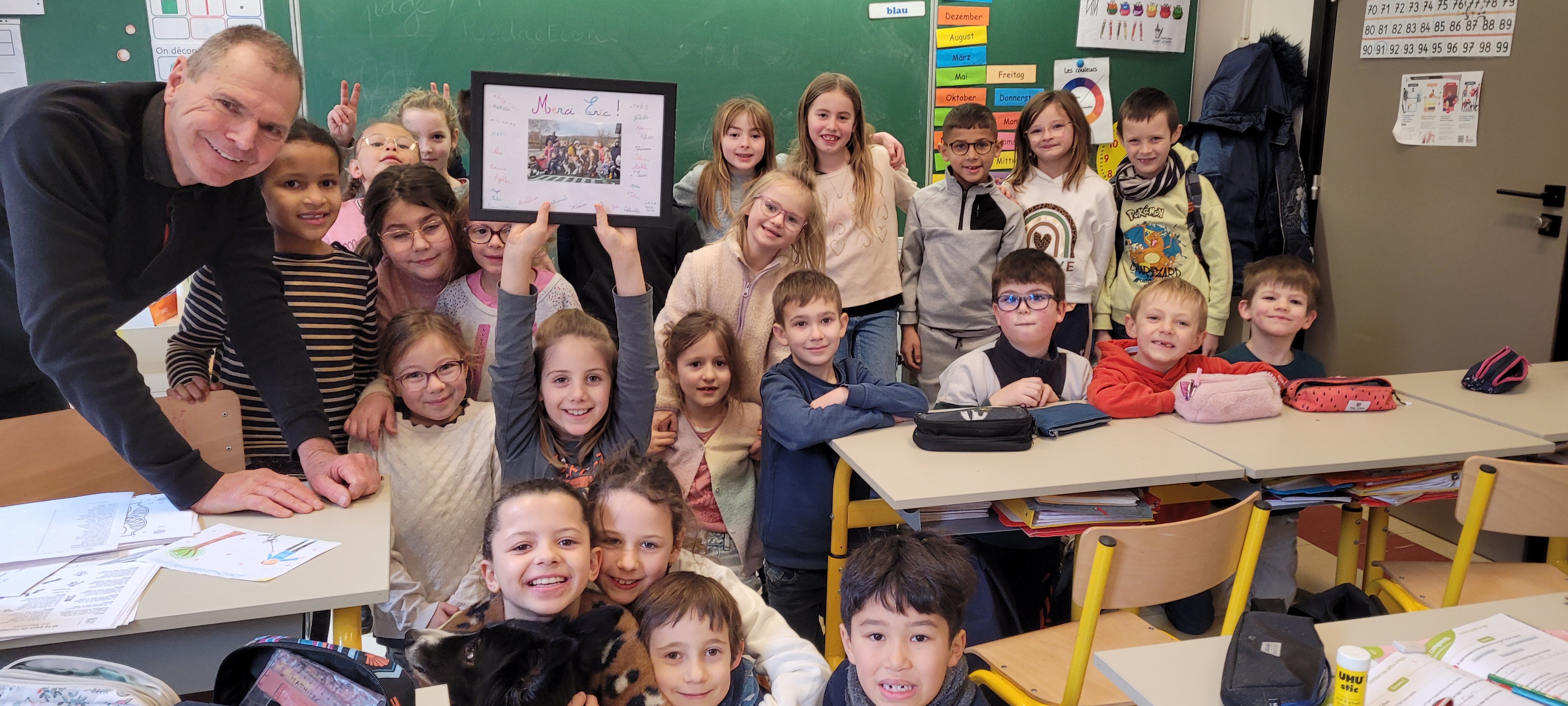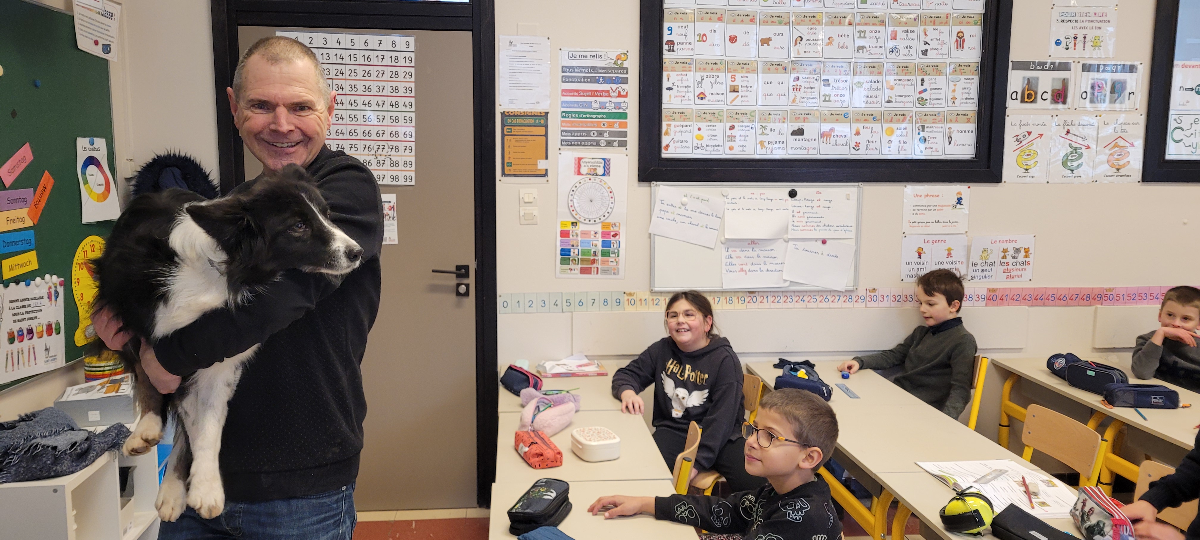 Toute cette 1ère moitié d'année scolaire, nos 2 fidèles "chiens visiteurs", Perle et Sultane, ont accompagné nos classes de CE1 et d'ULIS. Par cet échange, nous expérimentons pour voir si la présence de l'animal peut aider à rendre encore plus serein un climat de classe, ou apporter un peu de soutien et de chaleurs à certains élèves... Après les vacances, ce sont 2 nouvelles classes qui vivront cette expérience !...