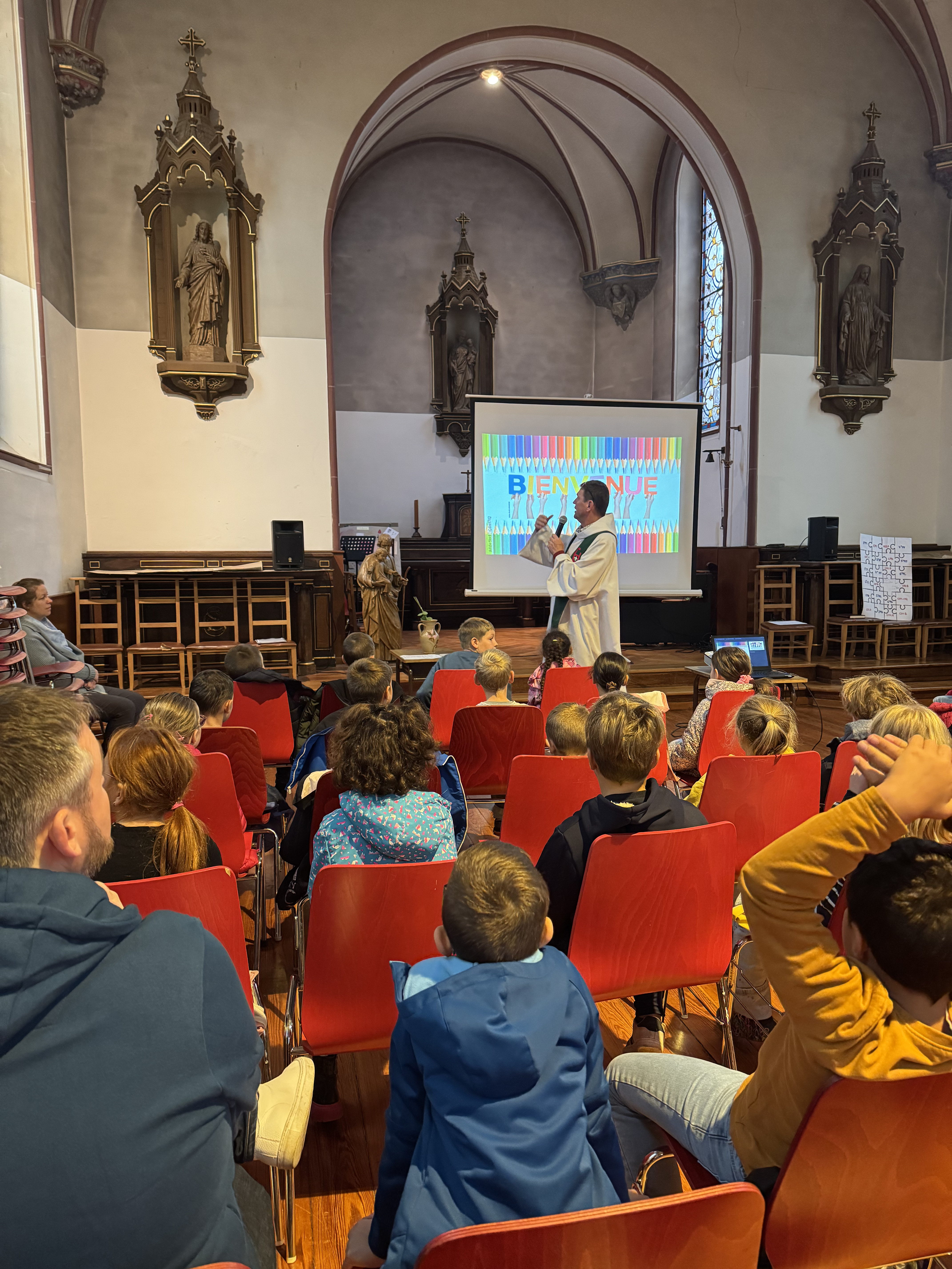 Ce jeudi, toutes les classes de l'Ecole Primaire ont vécu un instant de partage, de vivre-ensemble et de spiritualité ou d'humanisme à la Chapelle de St-Jo. L'occasion de se souhaiter encore une belle année scolaire, tout en insistant sur des valeurs de générosité, d'ouverture, et de sens du collectif ; avec également un temps d'intériorité, juste pour soi, dans le respect des croyances de chacun...