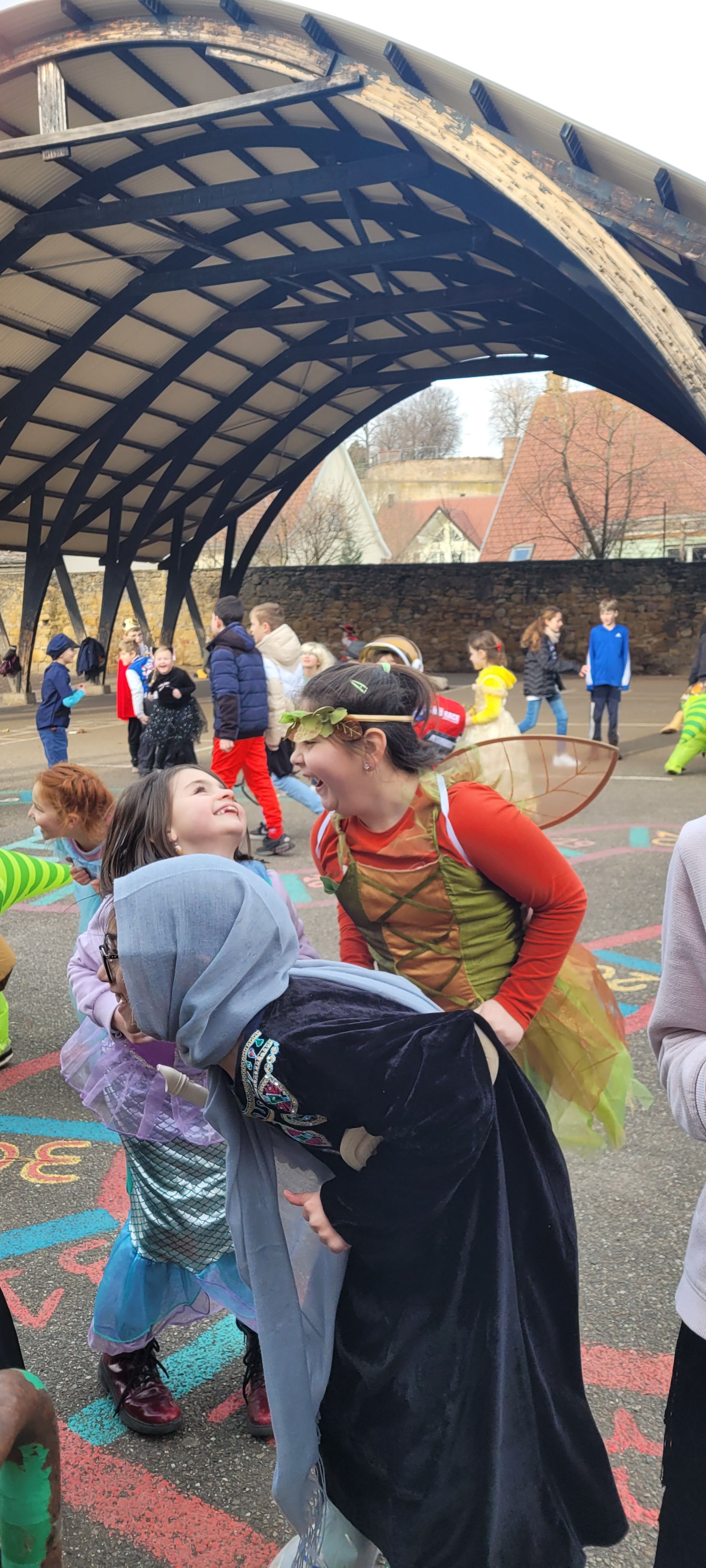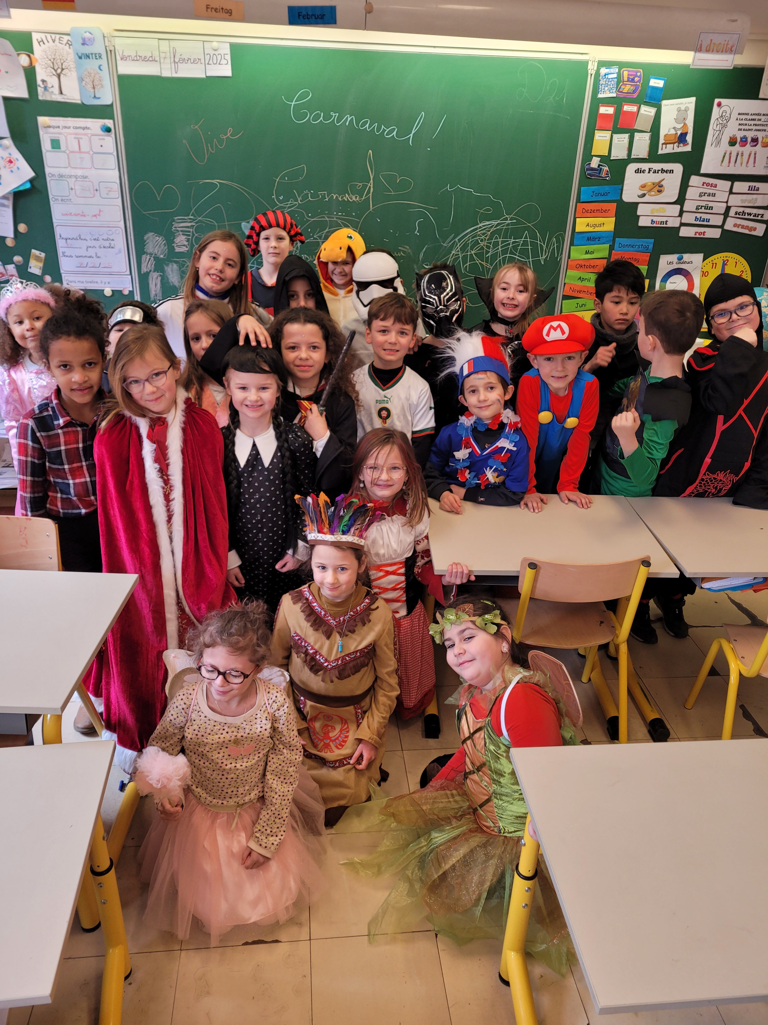 C'est désormais une tradition, tout Saint-Jo se déguise le dernier jour avant les vacances d'hiver afin de s'offrir une journée spéciale, avec tout l'Etablissement !... Ainsi, une joyeuse cohorte d'enfants a déambulé dans les couloirs pour aller gentiment mais bruyamment saluer les "grands frères" du Collège, et taquiner les équipes administratives !... Par la suite et dans une ambiance de discothèque de plein air, nos élèves se sont déhanchés sur les rythmes de notre "dj maison", qui a exceptionnellement troqué règle, compas et équerre contre ses platines !... Enfin, un grand Merci à nos CM2 qui ont offert gourmandises et douceurs à tous les enfants de l'Ecole (et même de l'Etablissement) autour d'un banquet carnavalesque !... Bien que le calendrier ne soit pas tout à fait respecté, nous aimons achever cette période dans une atmosphère de joie, de bonne humeur et de convivialité, principes chers à Saint-Joseph...
